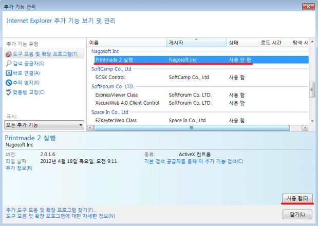 Internet ExplorerÀÇ ¸Þ´º¿¡¼ [µµ±¸] ¡æ [Ãß°¡±â´É °ü¸®] ¿¡¼ ¡°Printmade 2 ½ÇÇࡱ Ãß°¡±â´ÉÀ» ¡®»ç¿ë ÇÔ¡¯ À¸·Î ¼³Á¤