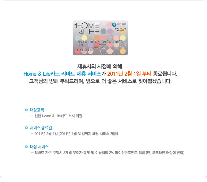 Á¦ÈÞ»çÀÇ »çÁ¤¿¡ ÀÇÇØ Home&LifeÄ«µå ¸®¹ÙÆ® Á¦ÈÞ ¼­ºñ½º°¡ 2011³â 2¿ù 1ÀÏ ºÎÅÍ Á¾·áµË´Ï´Ù. °í°´´ÔÀÇ ¾çÇØ ºÎʵ叮¸ç, ¾ÕÀ¸·Î ´õ ÁÁÀº ¼­ºñ½º·Î ã¾ÆºË°Ú½À´Ï´Ù.