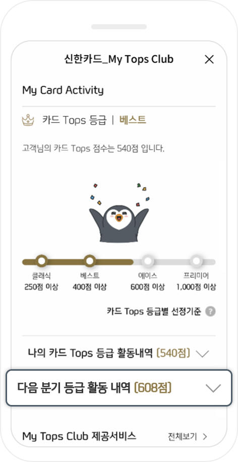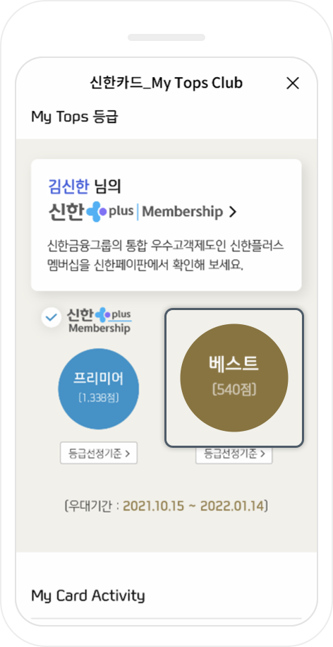※ 신한카드 Tops Club 등급: 프리미어, 에이스, 베스트, 클래식