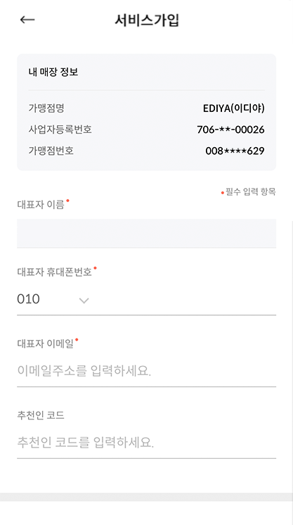 4. 사업장 정보와 추천인 코드 ‘12345678’를 입력해주세요.