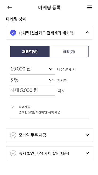 게다가 마케팅 비용도 신한카드가 부담한답니다.(단, 마케팅 상세 종류 ‘즉시할인’은 가맹점주 100% 부담)