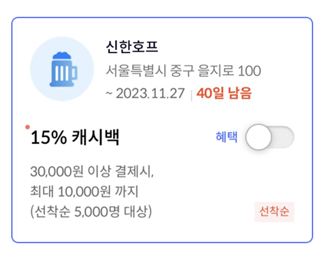 - (동네) 마이샵 쿠폰을 ‘혜택 ON’한 후 해당 매장에서 신한카드로 결제하면 됩니다.