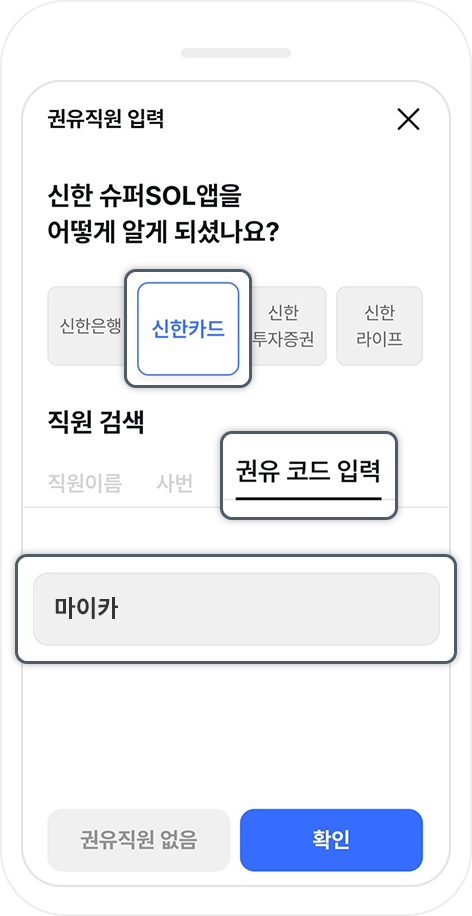 ※ 가입 권유 직원 페이지에서 [신한카드] 선택 > 권유코드 ‘마이카’ 필수 입력