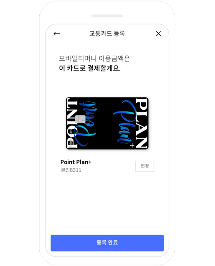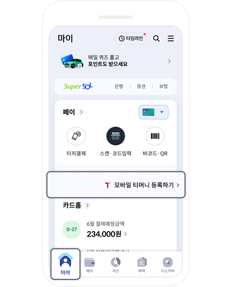 - ※ ‘마이’ 메뉴의 [모바일티머니] 버튼을 통해 간편하게 등록하실 수 있습니다.