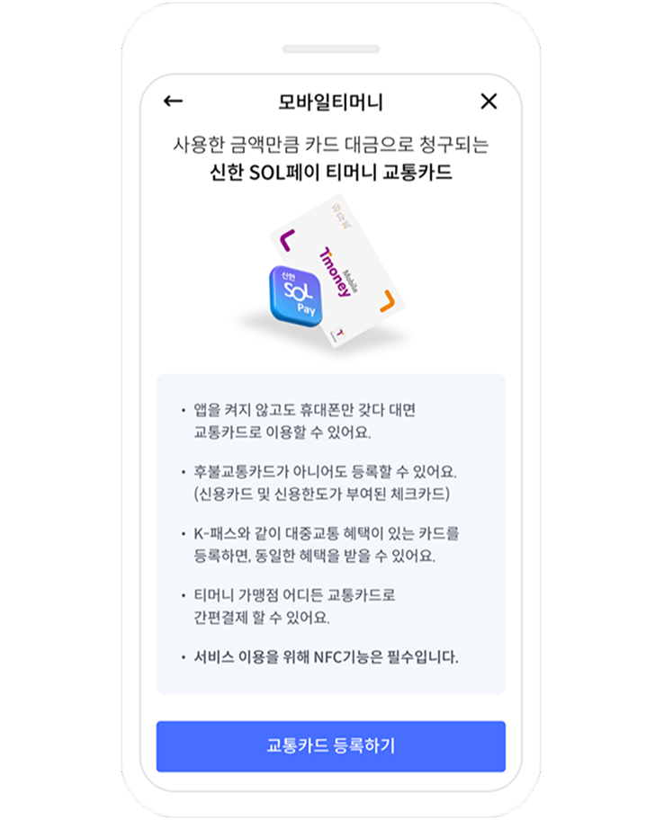 SOL페이 티머니는 신용/체크카드를 모바일 티머니에 등록하고 별도 충전없이 사용한 만큼 청구되는 후불청구형 교통서비스입니다.