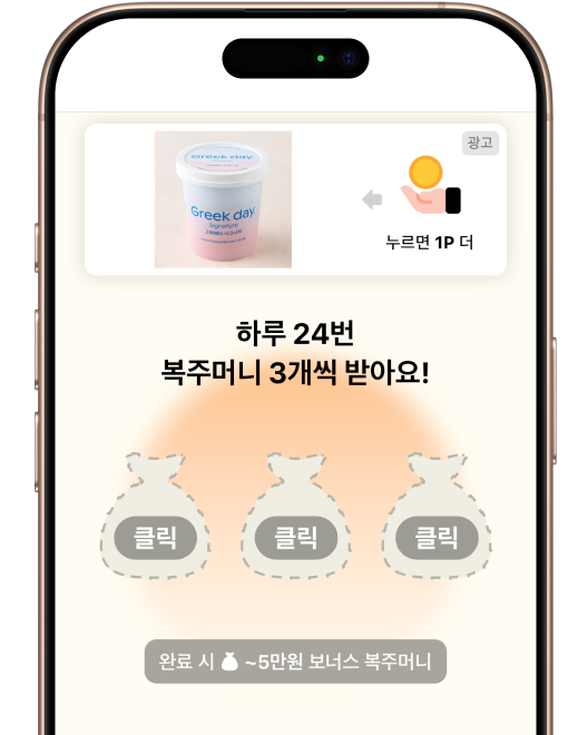 복주머니 : 혜택 > 투데이 > ‘광고보고 포인트 받기’ > ‘복주머니’ 클릭!