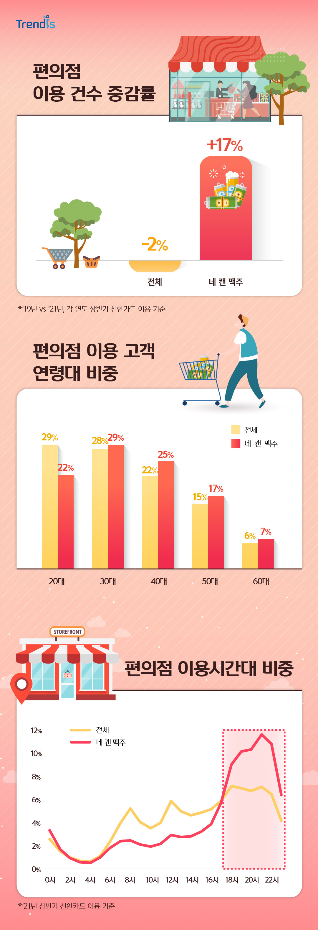 - 전체 -2%, 네 캔 맥주 +17%(*2019년 Vs. 2021년, 각 연도 상반기 신한카드 이용 기준)