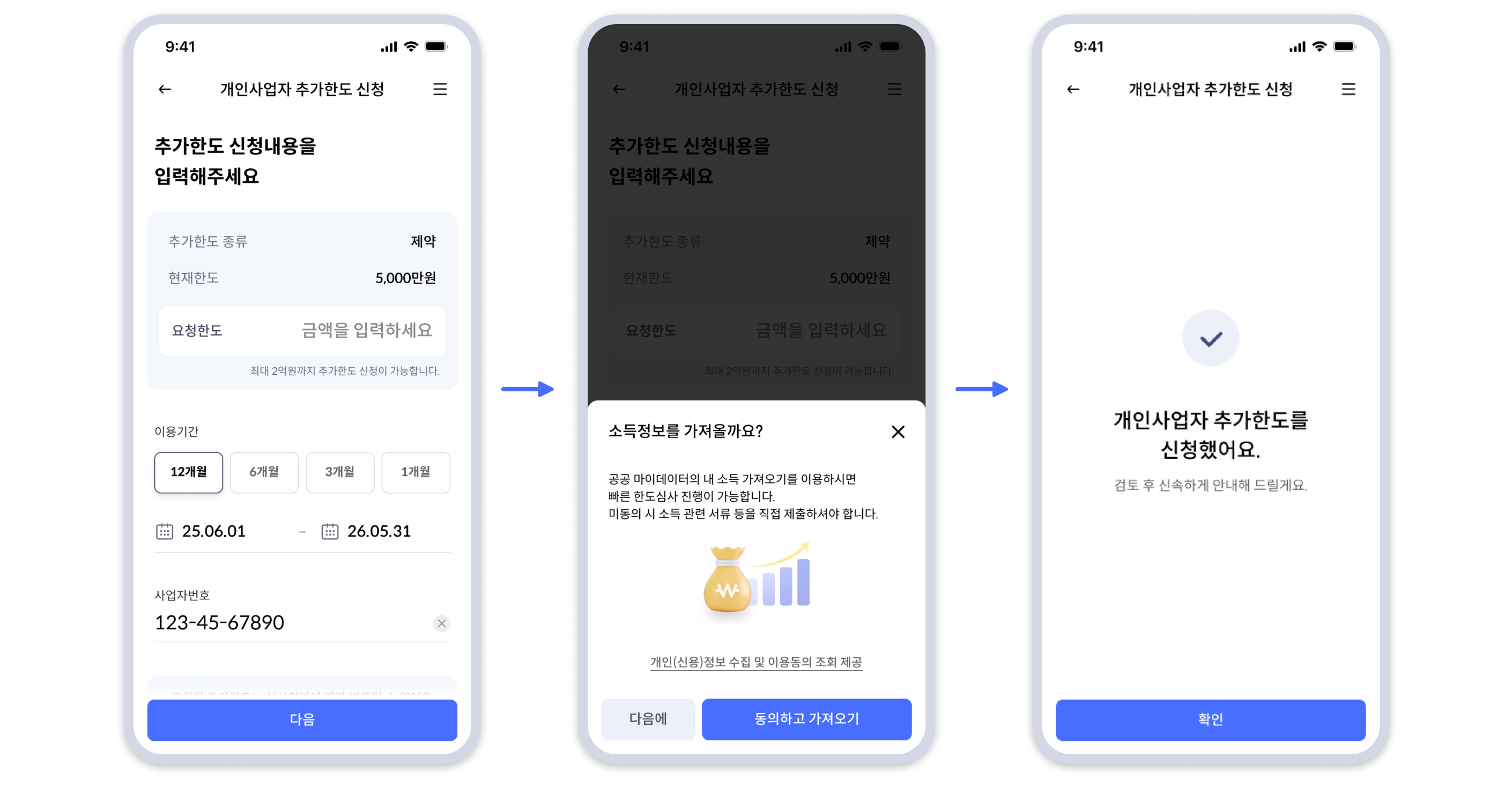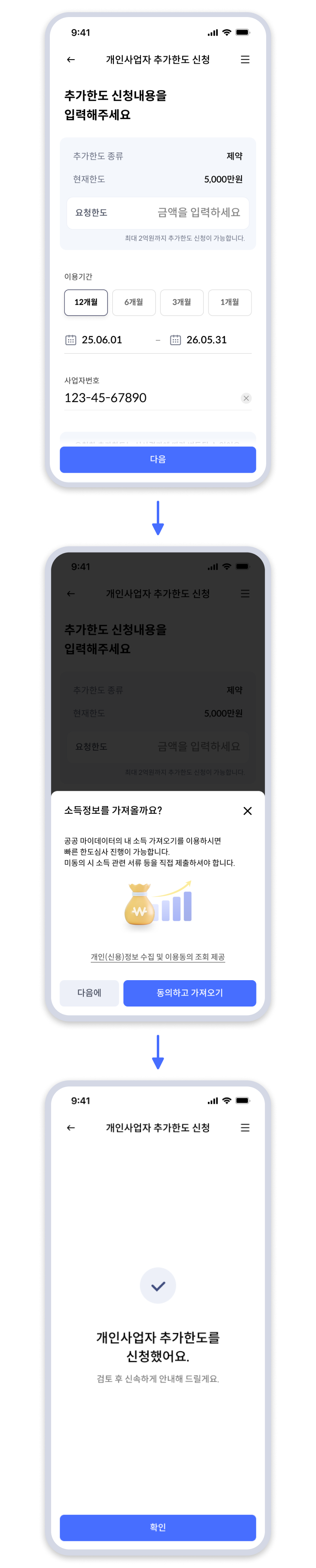 공공마이데이터를 활용해서 고객 동의 및 사업자등록번호 입력만으로도 한도 상향되도록 프로세스 개발