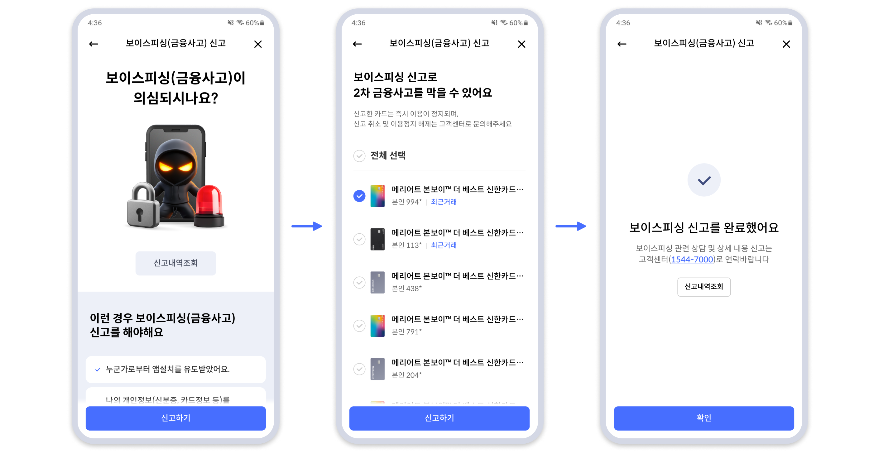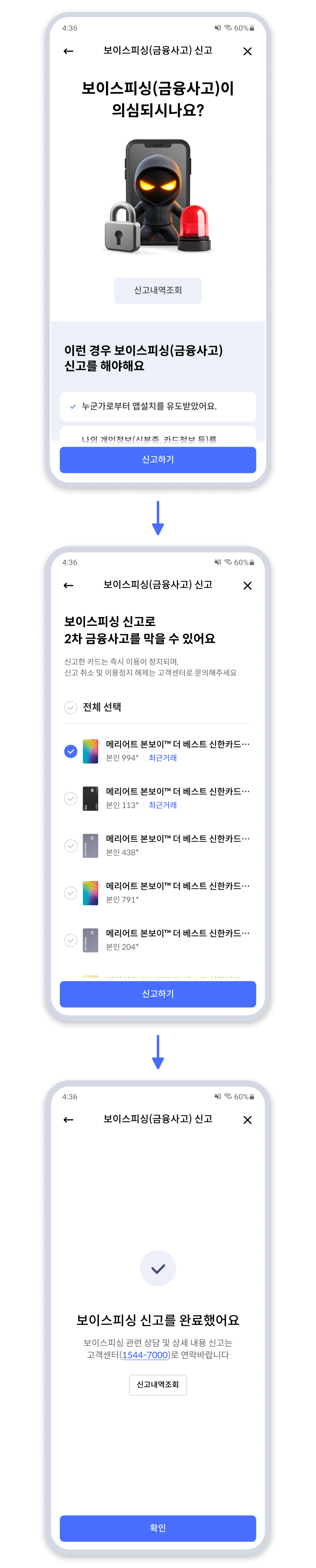 쏠페이앱(홈페이지) 보이스피싱(금융사고) 신고 안내 화면에서 [신고하기] 버튼을 선택하고 보유하고 있는 카드 목록으로 진입. 신고할 카드를 선택한 뒤 [신고하기] 버튼을 선택하면 신고가 완료됨. 신고 완료 화면과 신고 안내 화면의 [신고내역조회] 버튼 제공