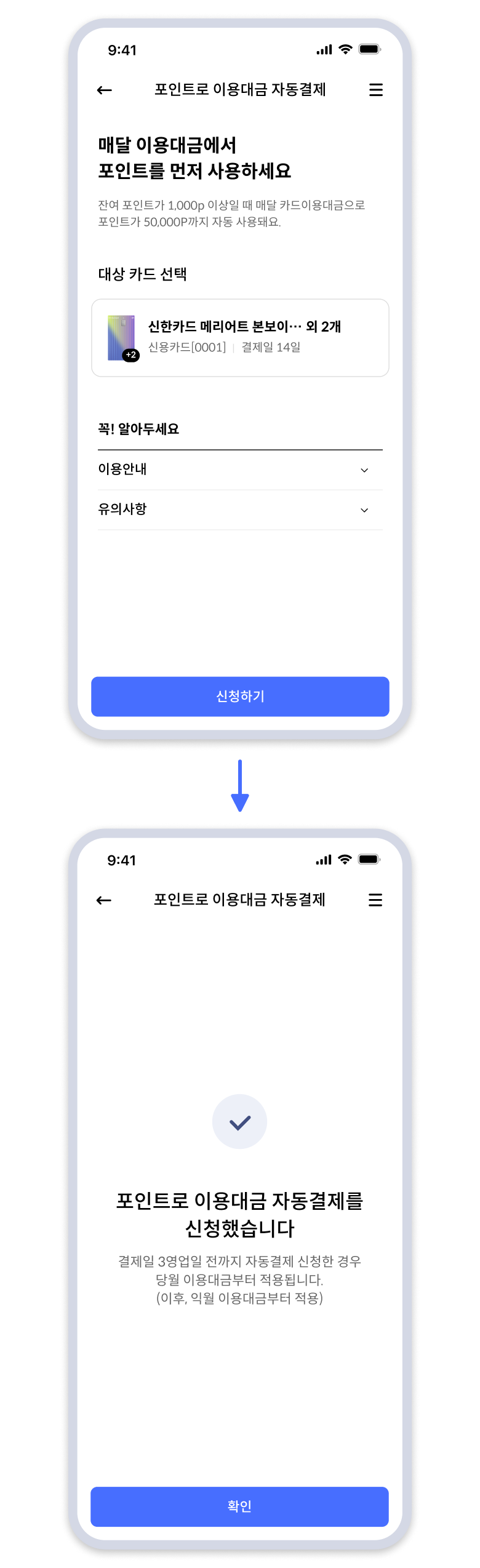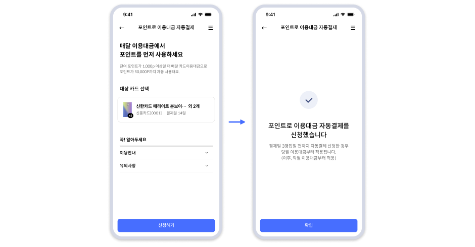 포인트로 이용대금 자동결제 화면에서 대상카드 선택 후 [신청하기] 클릭하면 신청 완료 및 결과 화면으로 이동함. (결제일 3영업일 전까지 자동결제 신청한 경우 당월 이용대금부터 적용되며, 3영업일 이후 신청 시엔 익월 이용대금부터 적용됨)