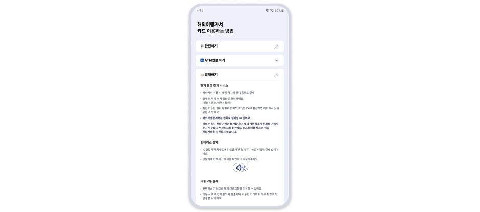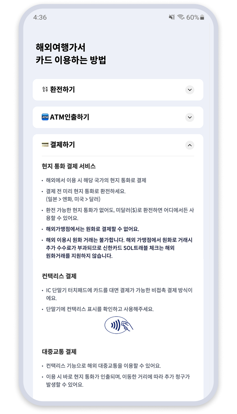 결제하기 안내에 "해외가맹점에서는 원화로 결제할 수 없어요. 해외 이용 시 원화 거래는 불가합니다. 해외 가맹점에서 원화로 거래시 추가 수수료가 부과되므로 신한카드 SOL트래블 체크는 해외 원화거래를 지원하지 않습니다." 포함되어 있음.