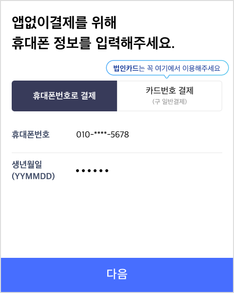가입 후엔 간단한 정보와 결제 비밀번호만 입력하면 결제할 수 있어요.