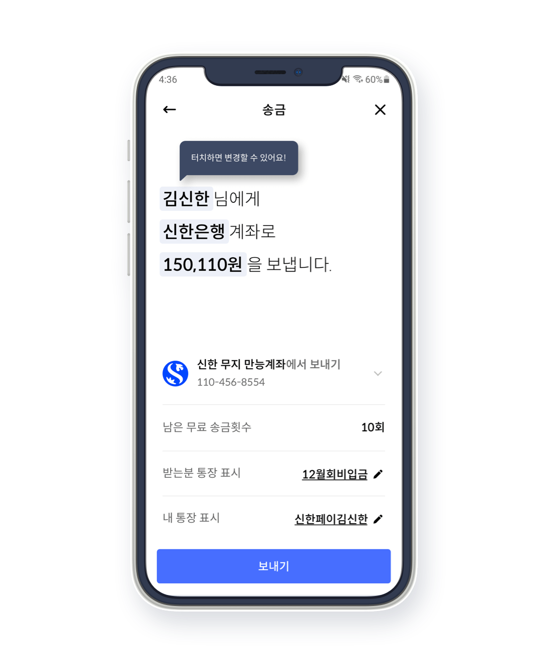 계좌로 송금하기 Step1. 오픈뱅킹으로 한 번에 오픈뱅킹으로 등록한 모든 계좌로 송금하실 수 있어요. Step2. 연락처로, 계좌로 계좌(오픈뱅킹) 송금은 연락처로, 계좌로 보낼 수있어요. 물론 내 계좌로도 송금이 가능해요. Step3. 무료로 송금 금액 입력 시, 최소/최대 송금 금액과 무료로 송금할 수있는 횟수를 알 수 있어요. Step4. 송금 정보 확인, 수정은 바로바로 보내기 전에 송금정보를 다시 한번 확인하세요.수정할 내용은 여기서 바로 고칠 수 있어요. Step5. 송금 완료! 송금 결과를 확인하세요. 결과는 문자나 카카오톡으로공유할 수도 있어요. 지금 이용해보기 팝업닫기